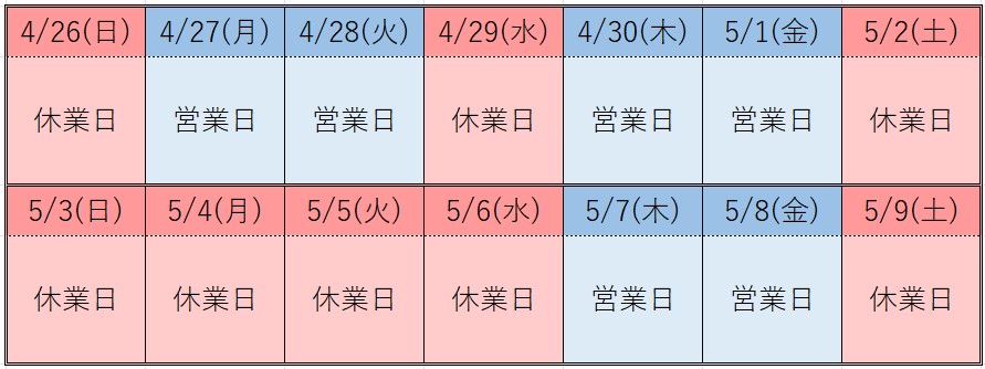 誠に勝手ながら、ゴールデンウィーク期間中の営業について下記の通りとさせていただきます。